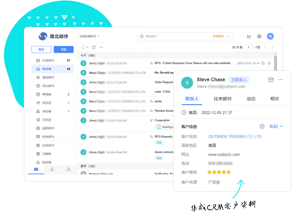 提供群发单收、邮件模板、报价单或商品资料嵌入邮件正文、阅读追踪、客户邮件已阅统计、回复跟踪、待回复提醒等功能。